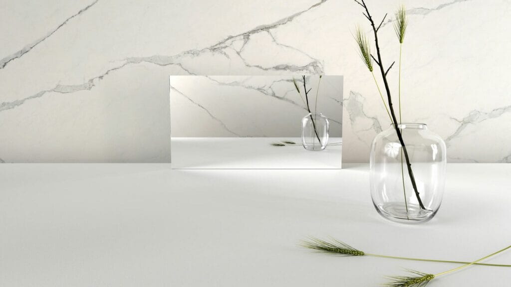 Replicating the calcite in natural marble, this white surface is overlayed with irregular veining in a series of smoky greys, from charcoal to whisper white. The sometimes bold sweeps of veins create a sense of movement within the surface. Honed finish.