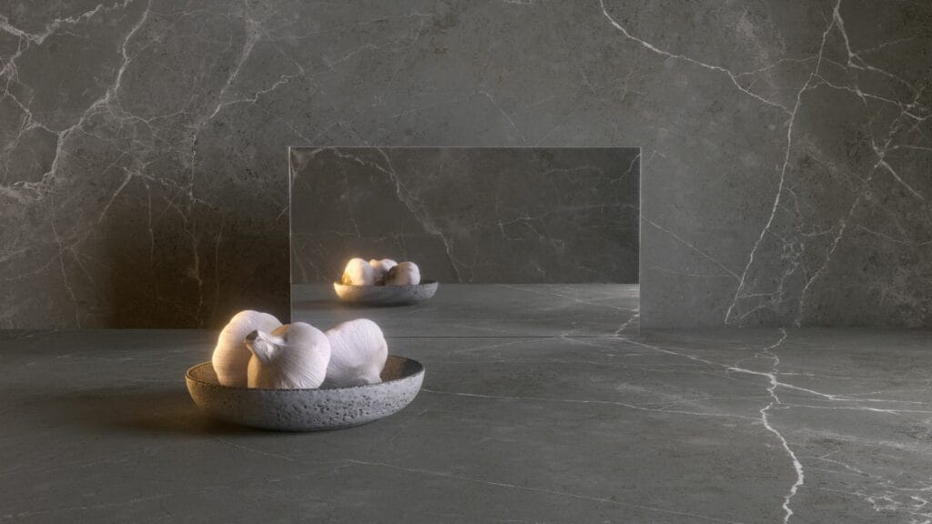 Replicating the sublime luxury of Emperador Fume marble, this Honed finish surface, in a mix of deep greys and earthy tobacco hues, features beautifully defined white veining. Small flakes of mineral deposits, together with subtle oxide layers, heighten the sense of drama