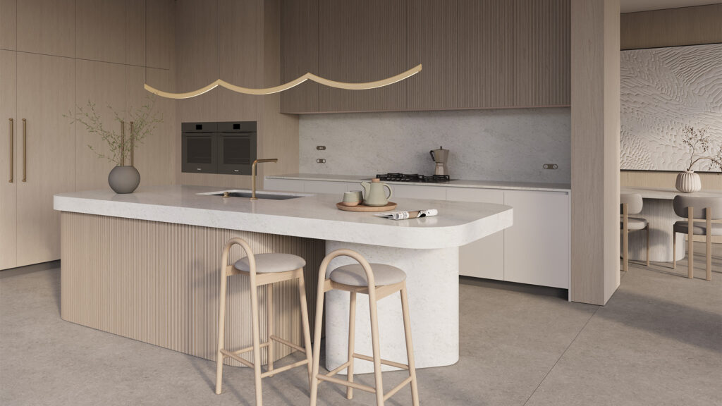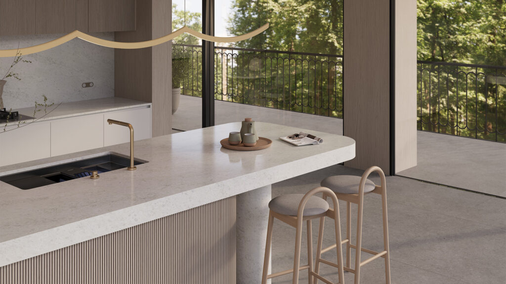 A frosted grey base overlaid with a direction drift of multi-form terrazzo chips in soft greys and earthy brown mineral deposits, creating a sense of movement and understated luxury.