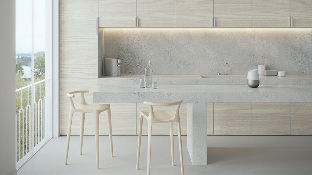 Airy Concrete samples are only indicative of a part of a slab, and we strongly encourage viewing displays in your nearest Caesarstone Showroom or Kitchen Retail Showroom to appreciate first-hand the nature of this high movement design. For any bench top greater than 20mm thick we recommend selecting mitred aprons to achieve the best surface-to-edge pattern continuity.