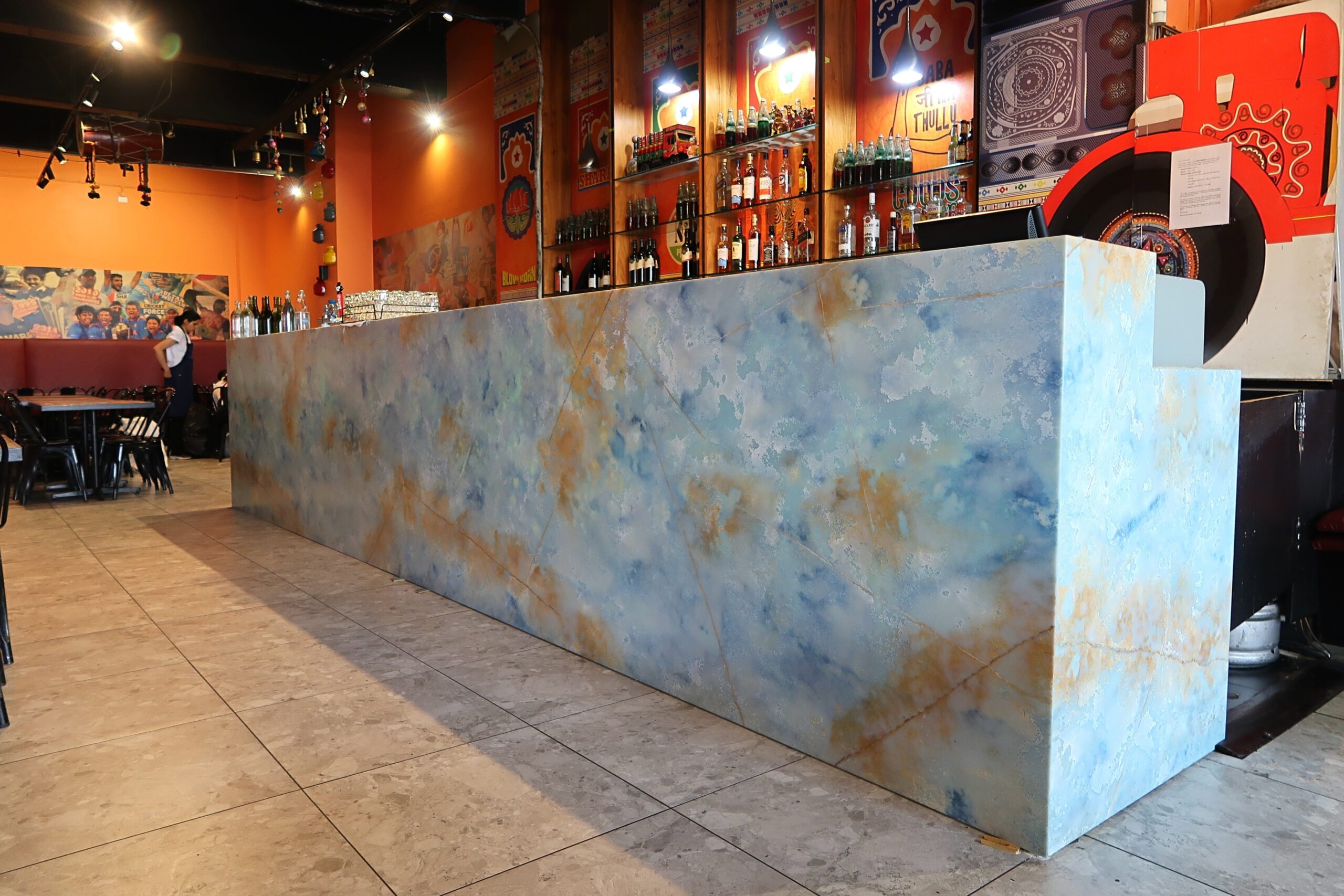 AC Stone Atlantis features a rich deep blue base with delicate veining, evoking the mysterious depths of the ocean. Its surface blends vibrant blue and orange hues, with subtle brown undertones. The stone’s translucent quality allows light to filter through, amplifying its natural allure. Inspired by the Onyx Onice Blue, this stone captures its essence beautifully.