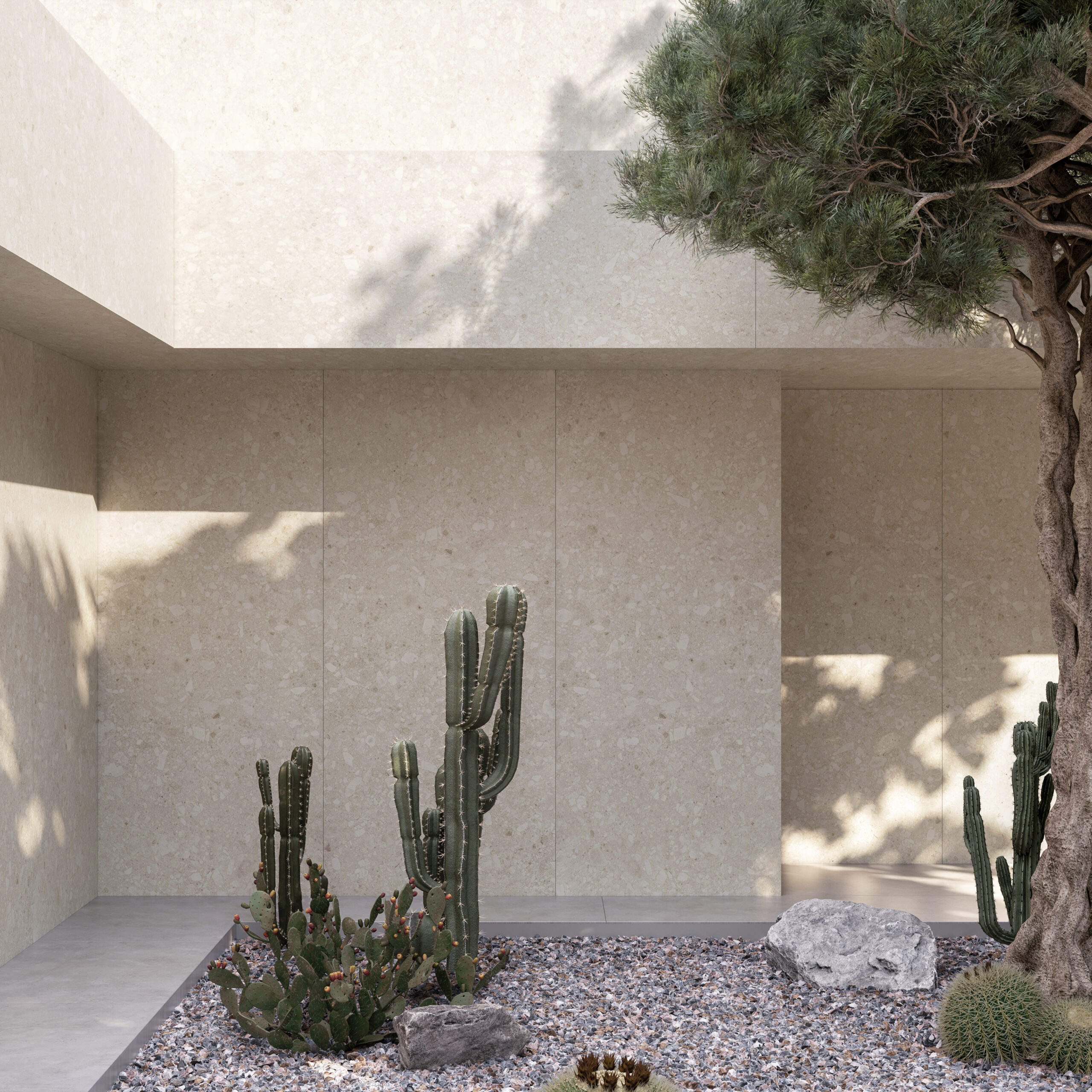 We have drawn on the distinctive, multiform structure of the Italian stone Ceppo di Gré to create an innovative finish in shades of cream not found in nature. A warmer design, particularly suitable for large areas of flooring or cladding, both indoors and out.