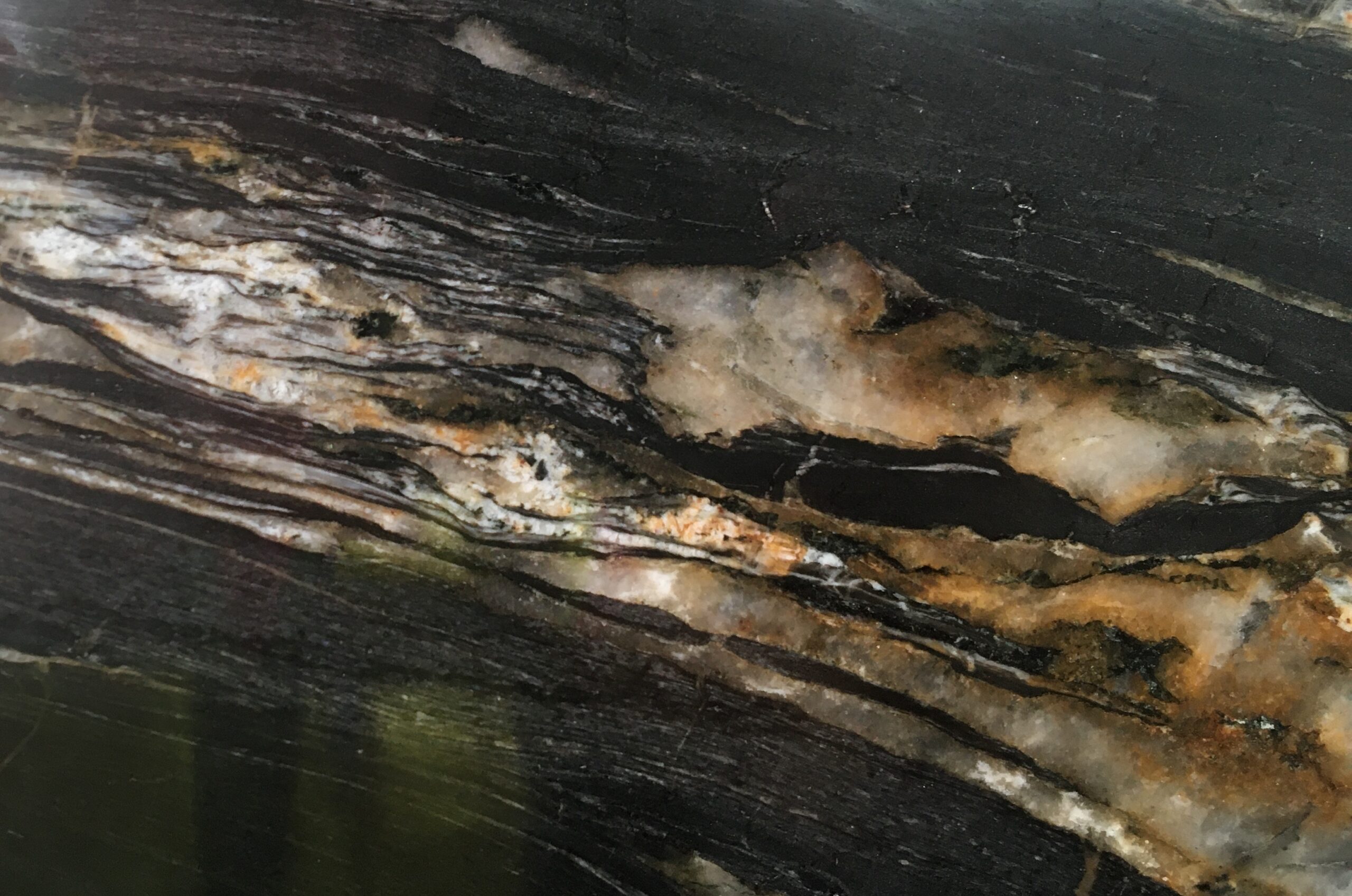Quartzite from Namibia, South Africa, with a striking contrast of mostly black base and large veins of white and copper hues.