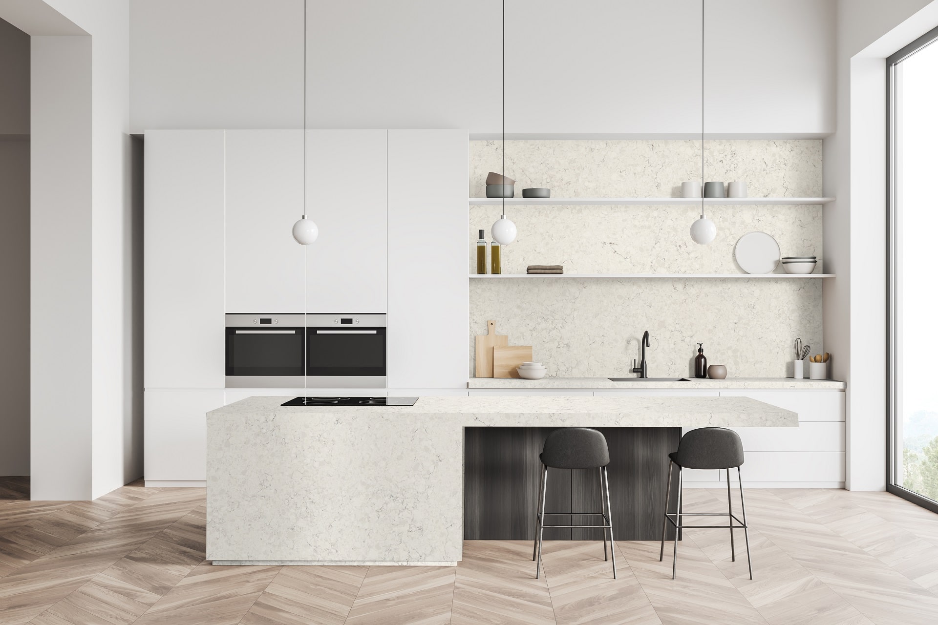 Bodrum features a soft white background with intricate, organic patterns resembling natural stone. The subtle veining and delicate texture create a luxurious yet versatile look, perfect for modern and classic interiors. Ideal for countertops, backsplashes, and flooring, Bodrum brings sophistication to any space.