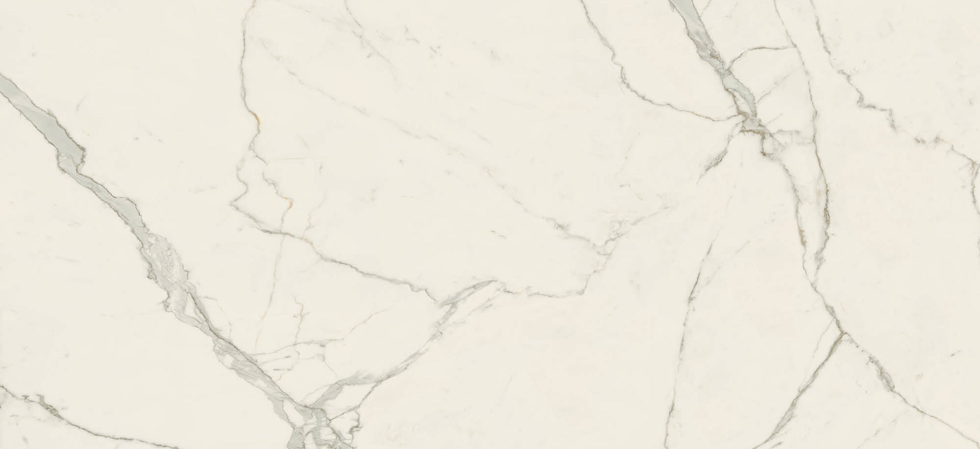 Calacatta Extra is a refined and versatile marble-effect porcelain characterised by a luminous white background, with striking grey veining and gold reflections.
