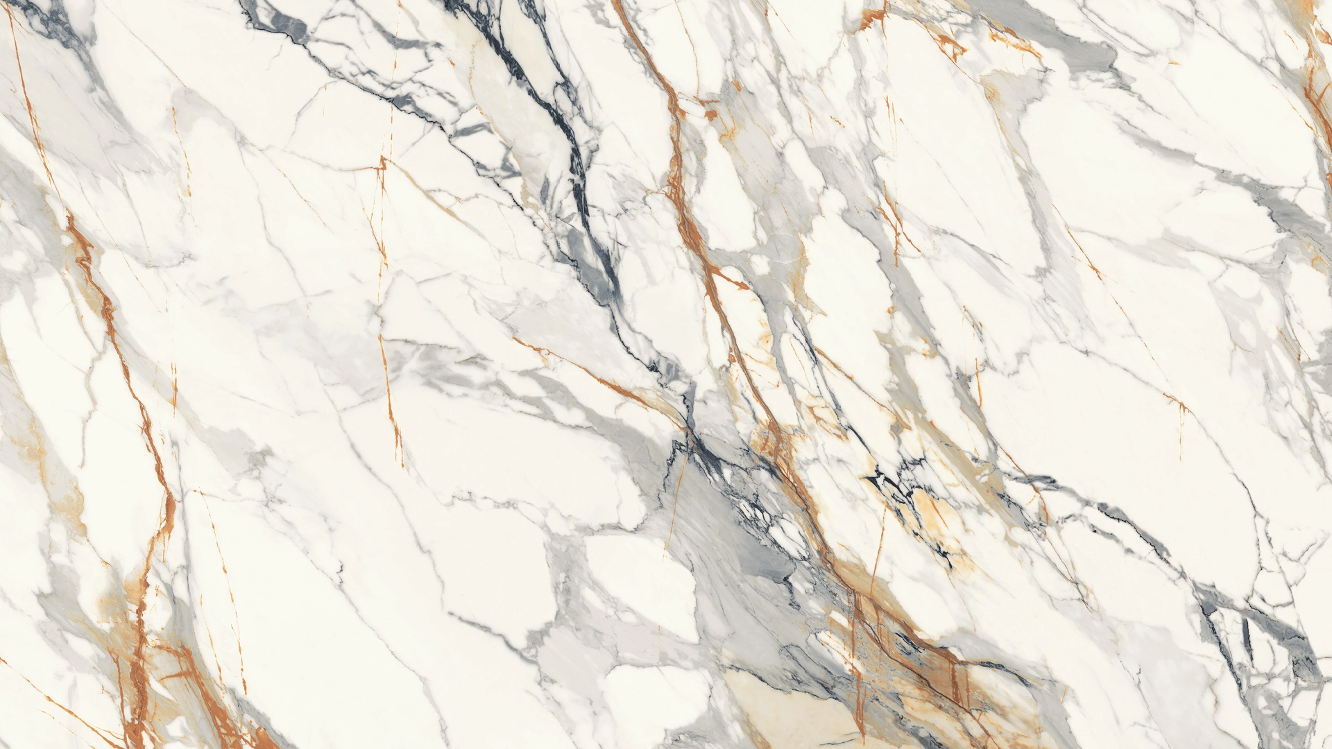 An opulent Italian marble style. Calacatta Lusso perfectly recreates the drama, colour and movement of Calacatta marble in sintered stone. Its stunning combination of gold, amber and grey veins sweeping across a grey-white background will pack a visual impact in any interior or exterior space.