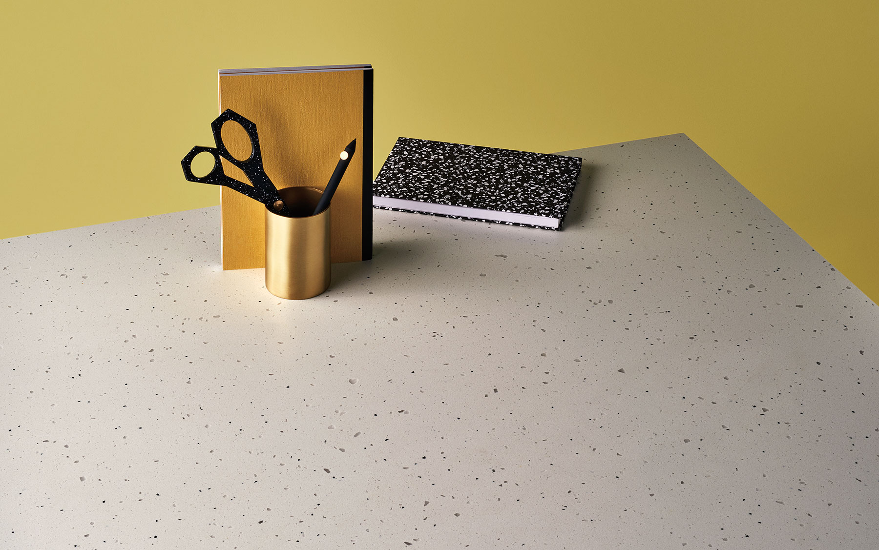 Fresh, modern, industrial-inspired concrete / terrazzo fusion with sparsely distributed irregular translucent aggregate and fine black basalt. Works with light & dark timbers, white to matt black doors, black taps or sinks.