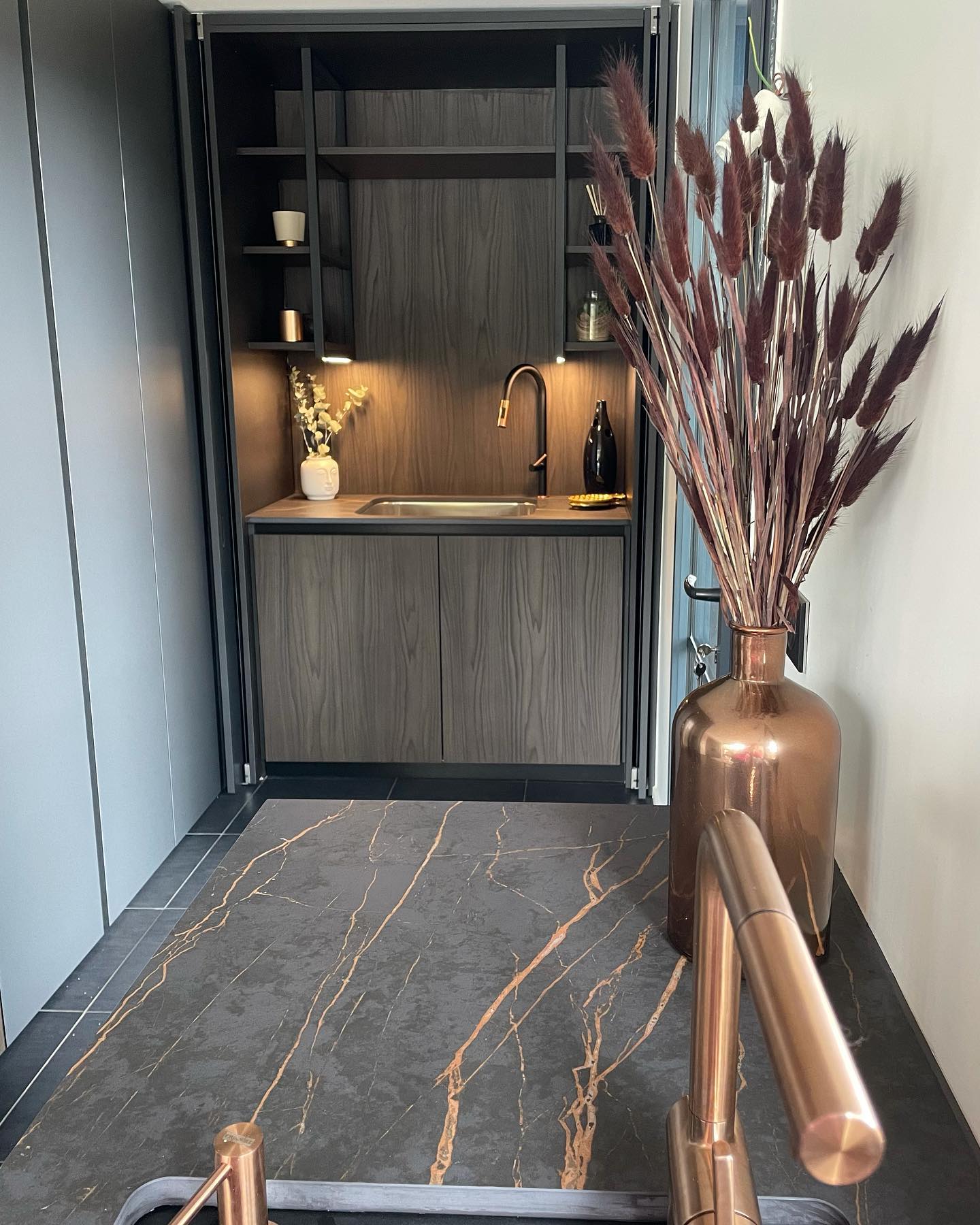 Inspired by the natural stone Port Laurent, the striking colourway features a dramatic dark brown background crisscrossed with veins of gold.