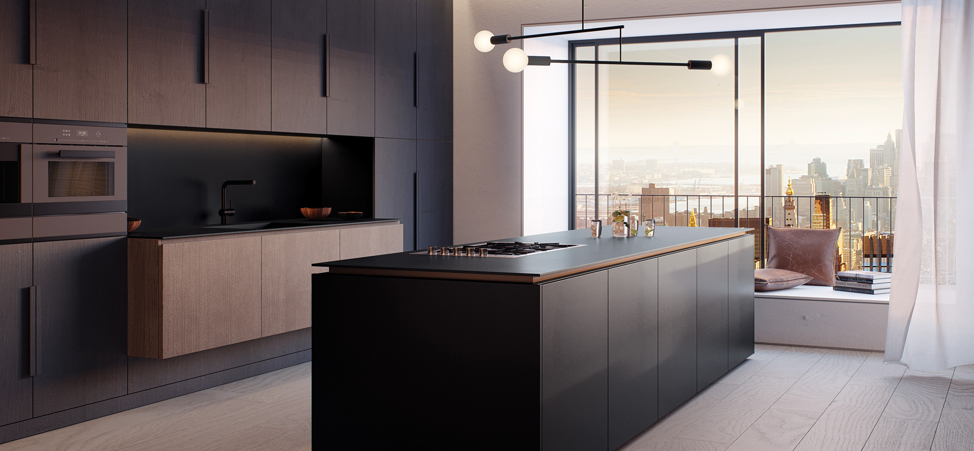Contemporary accents in the new dark kitchen include brass chrome and brushed copper finishes while larger co-ordinating surfaces include marble, medium to dark woodgrains and industrial concrete floors. In hospitality, Piatto Black™ combines with oxidised alloys and other blackened finishes to create a new atmosphere in bars, lobbies and restaurants.