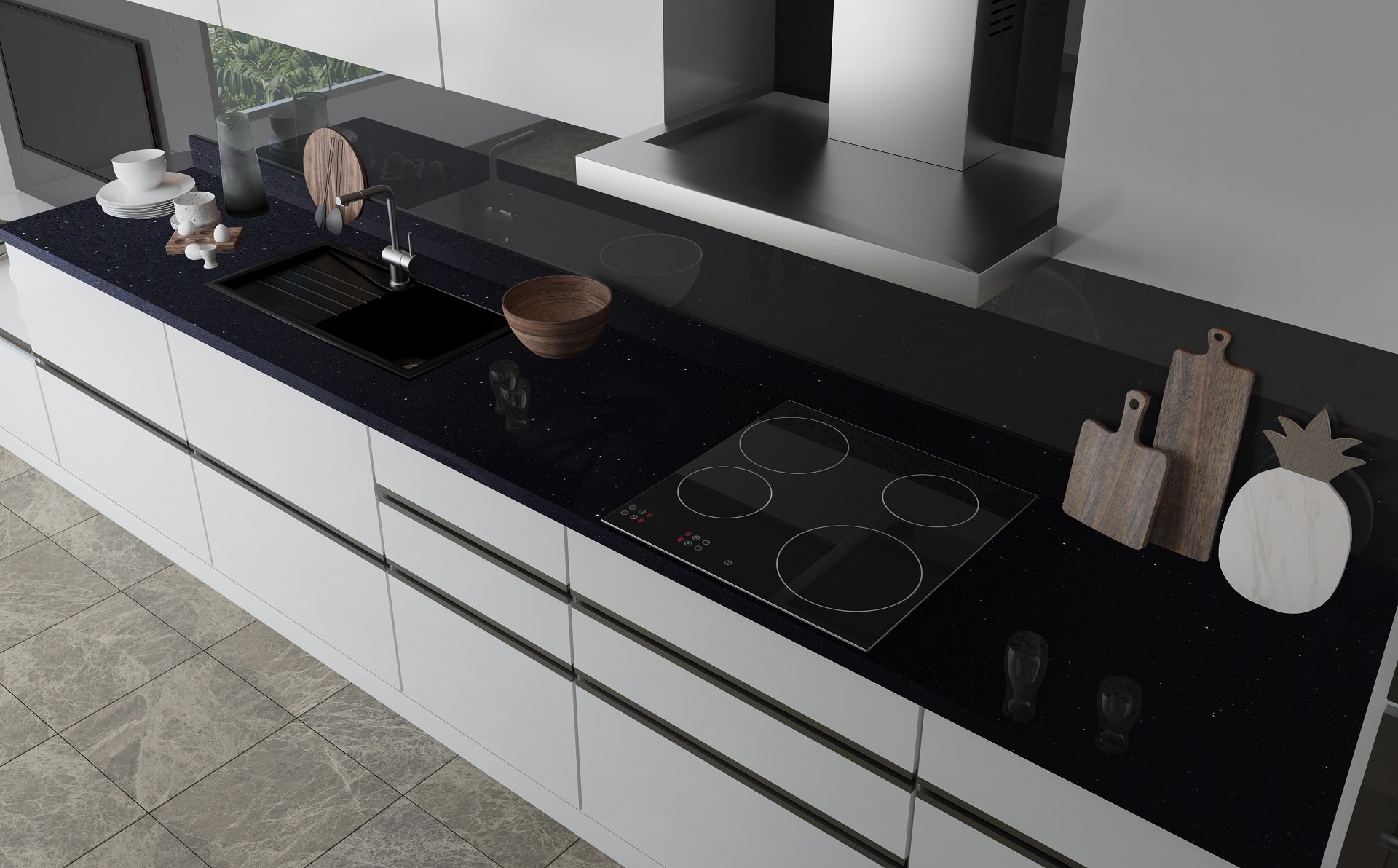 Sparkly Black features a deep black base with shimmering flecks, creating a starry-night effect. Durable and stylish, it’s ideal for countertops, backsplashes, and accent walls.