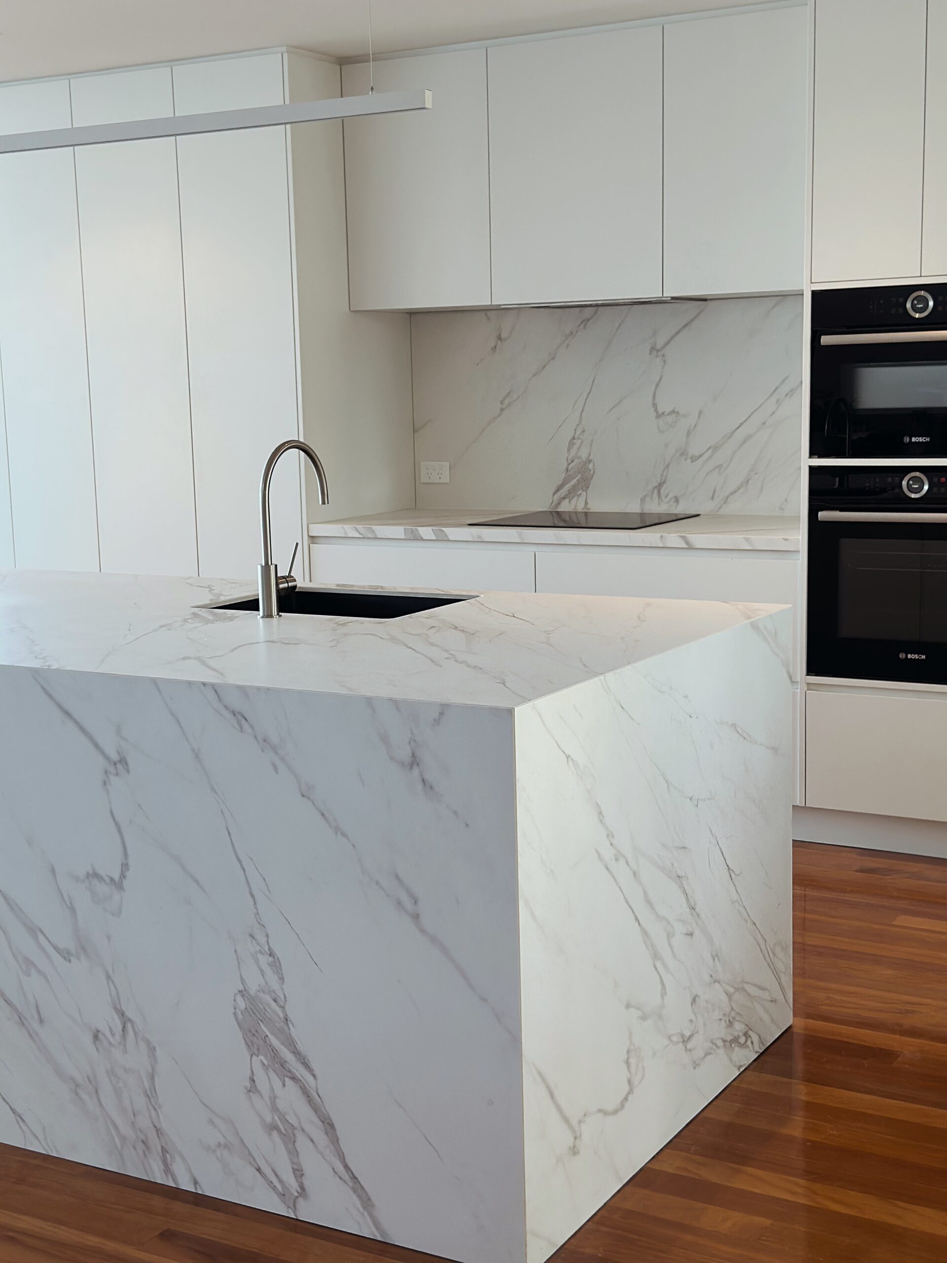 AC Stone Statuario is confident and timeless. Characterised by its clean white base, and cascading thin and medium sized grey veins, AC Stone Statuario is easily the centre piece in any home. Use AC Stone Statuario for a wide variety of surfaces including kitchen bench tops, counter tops, splash back, bathroom vanity, bathroom walls and more.