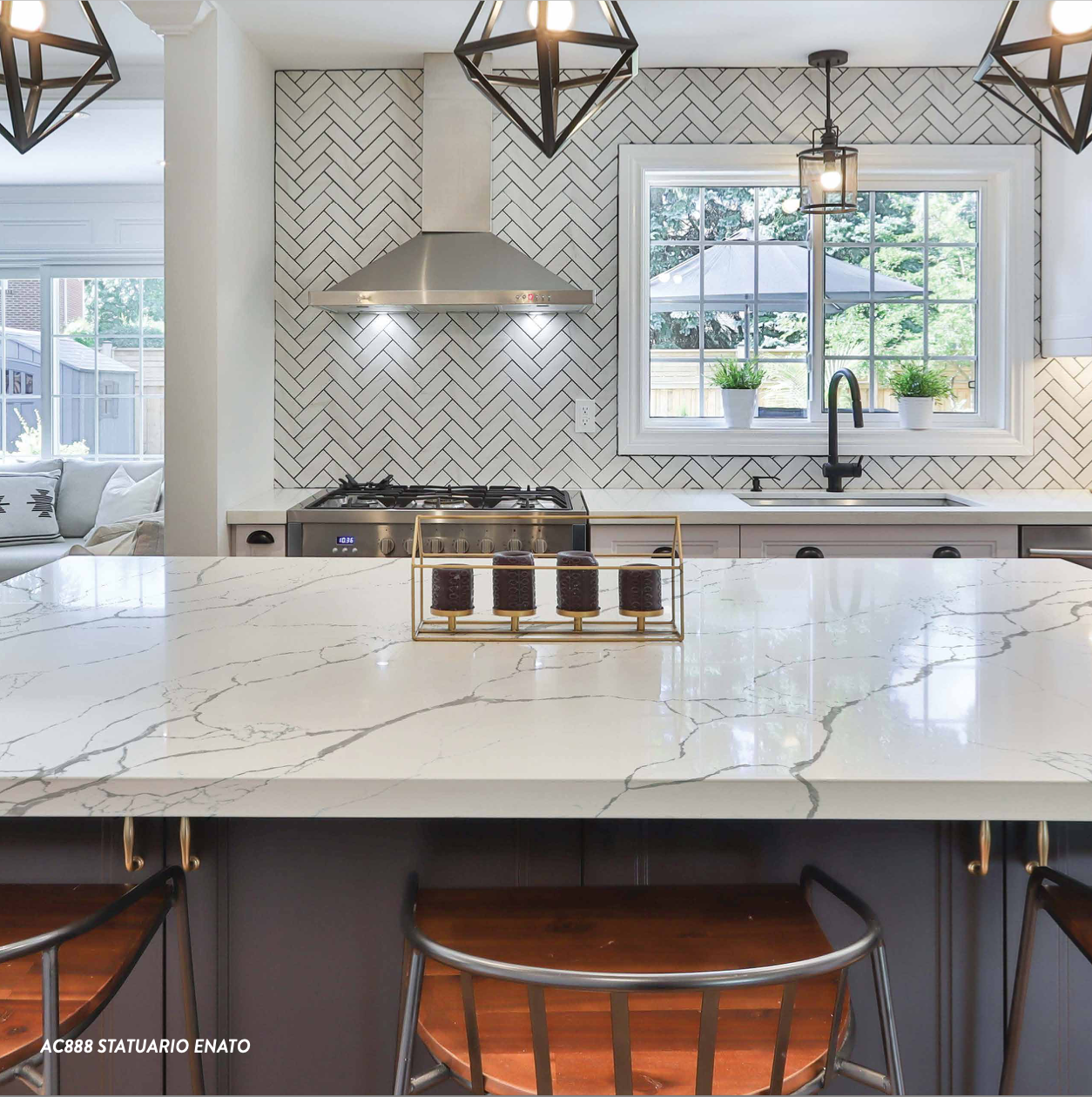 AC Stone Statuario Enato is a white base with brown-grey thin veining cascading diagonally throughout the piece. This piece has a subtle mix of long and webbed veining, which ensures there is a good mix of design in every piece of the stone. AC Stone Statuario Enato pairs well with many different interiors, particularly dark timber or black cabinetry.