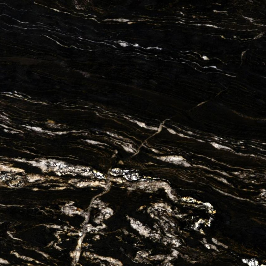 Quarried in Brazil, Titanium Granite is a bold natural stone defined by its deep black base, enriched with flowing white and gold crystallisations. The striking movement across the surface creates depth and elegance, making every slab unique. Finished in a tactile leathered texture, this granite offers both durability and style. Perfect for kitchens, bathrooms, and outdoor applications where a sophisticated statement is desired.